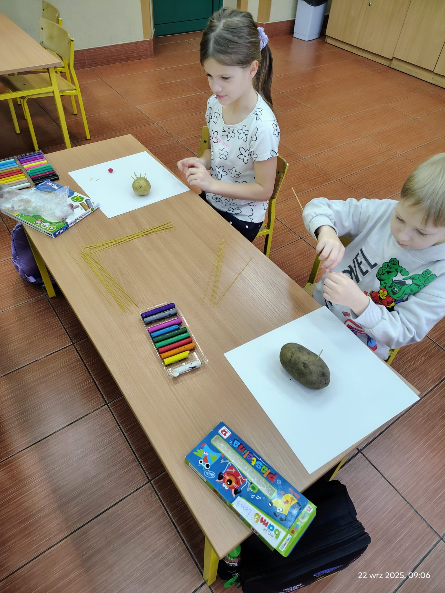 Jeże z ziemniaka i makaronu z połączeniem plasteliny wykonały na zajęciach z sensoplastyki dzieci z klasy 1B i 2C