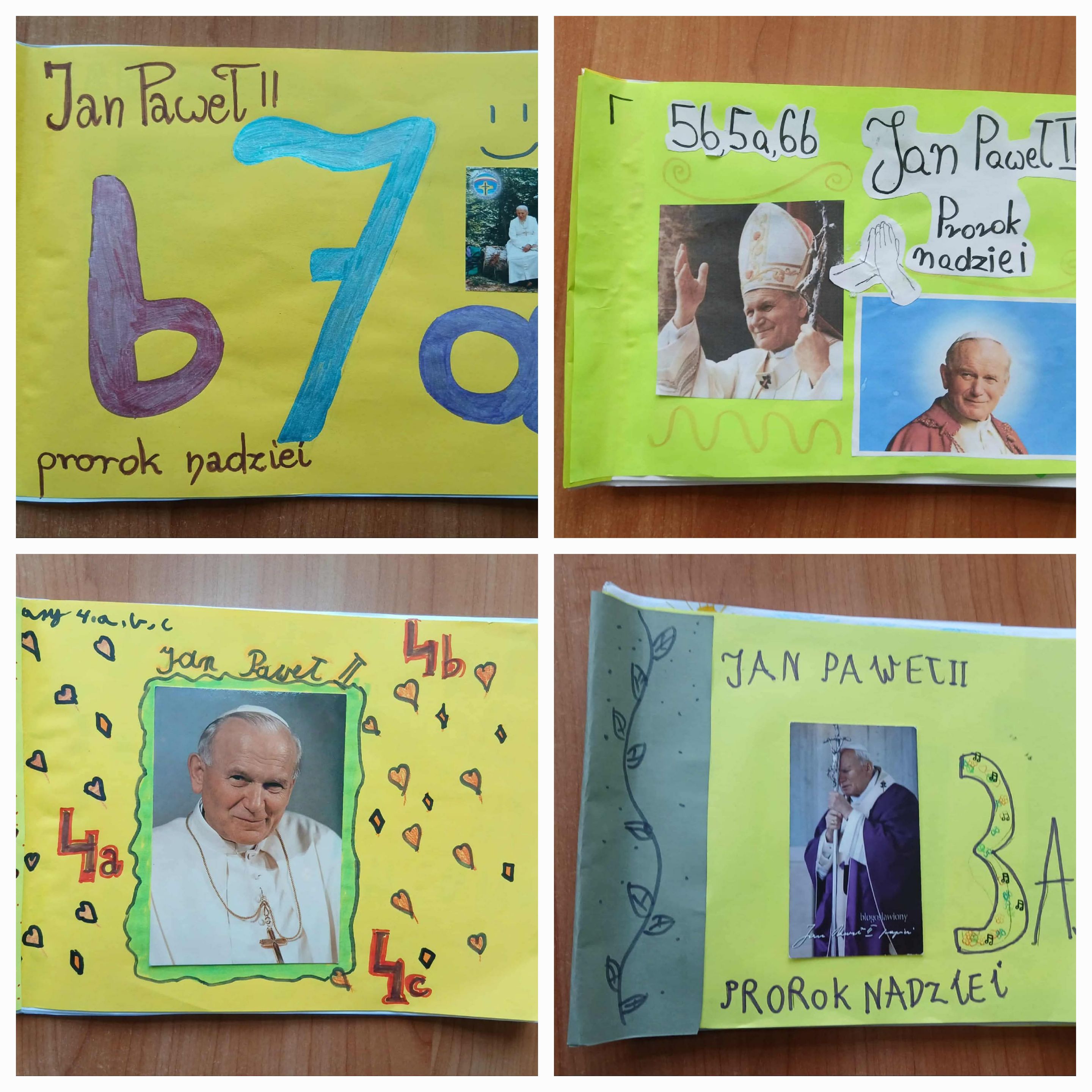 Jan Paweł II - Prorok Nadziei. Tak brzmi hasło tegorocznego Dnia Papieskiego. My również włączyliśmy się w obchody rocznicy wyboru papieża Polaka. Tym razem NOWOŚĆ. Każda klasa tworzyła album ze zdjęciem lub kolorowała Jana Pawła II. Starsi uczniowie wyszukiwali zdjęcia papieża w starszych gazetach i umieszczali je na kolejnych stronach klasowych albumów. To nie wszystko. Uczniowie losowali cytat Jana Pawła II o nadziei i zapisywali go. Dzięki temu nie tylko przypomnieliśmy sobie Jego postać, ale także nauki. Na koniec wszystkie wykonane przez uczniów strony zostały połączone w całość. Tak powstały nasze szkolne albumy.